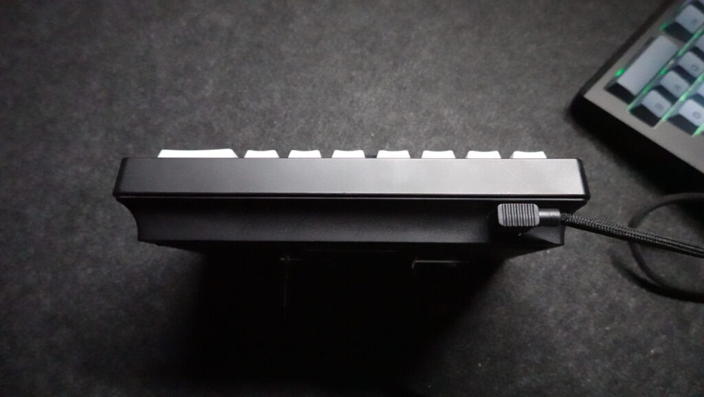 左側キーボード上部には給電用USB-CとPCとの接続方法の切り替えスイッチがあり、有線接続・Bluetooth・2.4GHz接続を選択できます。2.4GHz接続用のドングルもここに収納されています。(写真4枚目)