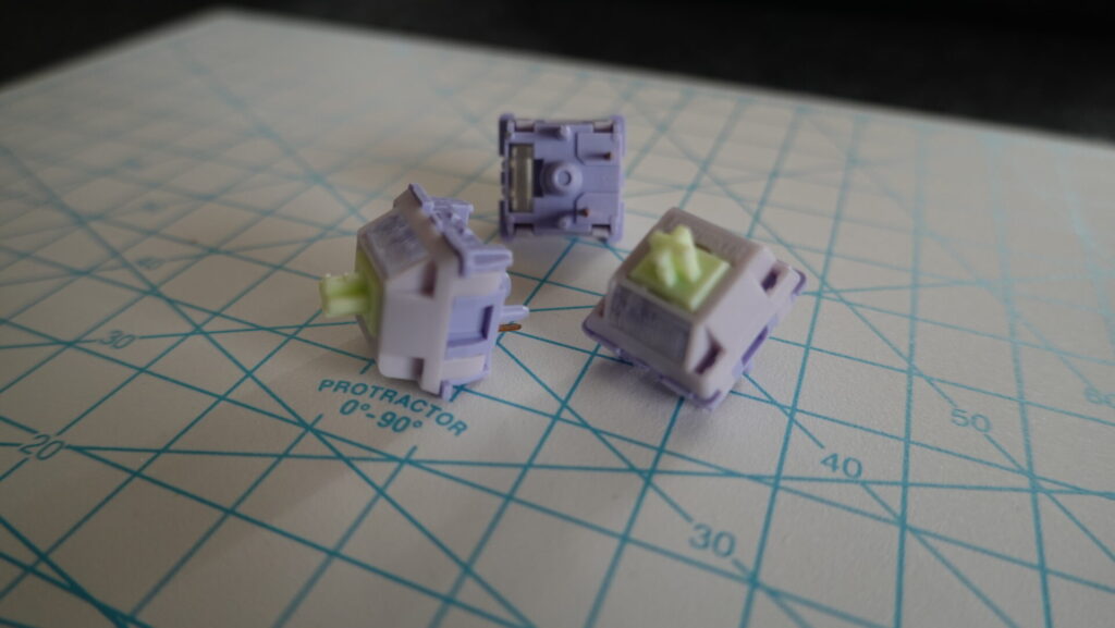 キースイッチは「Wisteria」を採用しています。POM+PTFEステム、PC+PA66ハウジングとなっており、MX構造キーキャップと互換性もあります。押下圧も軽すぎずちょうどいいスッと押す感覚です。