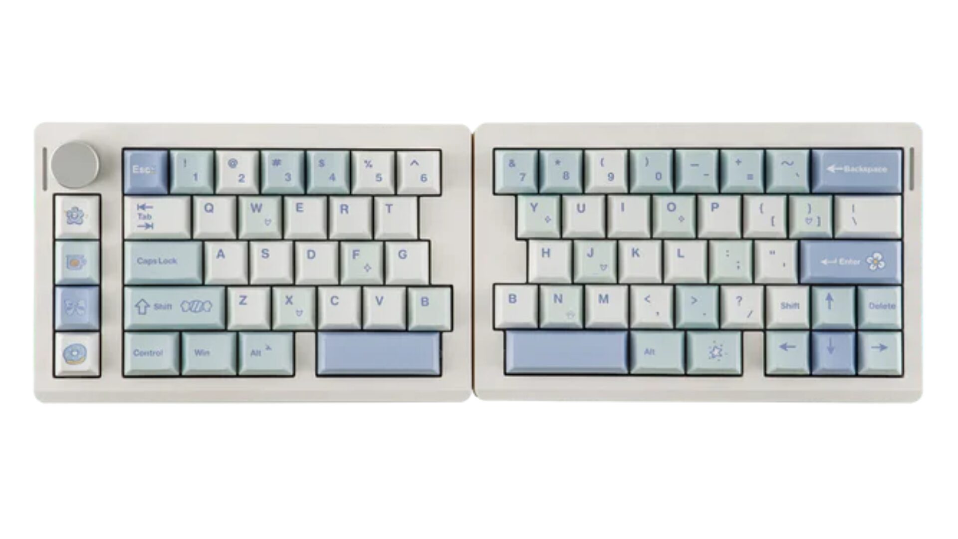 SPlit70にはブラック以外にも、ホワイトXブルーXペールブルーVerがあります。キーキャップにイラストが入っており可愛いビジュアルになっています。